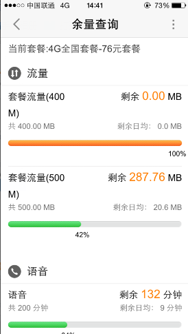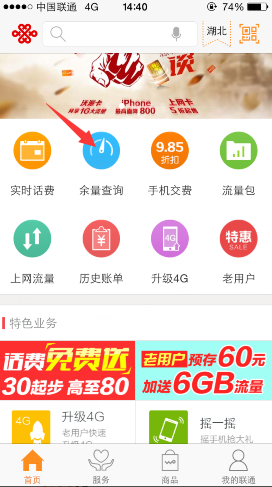 如果你是普通联通用户,并没有开通套餐。或者只想查询流量的话,就在首页点击余量查询,在这里,你可以看到套餐剩余流量、语音通话时长等。