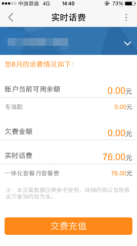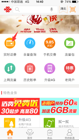 如果你手机里下载了联通手机营业厅的话,只需进入首页即可看到实时话费查询,点击后,会显示你当前可用余额、欠费金额以及实时话费。小编是4G套餐,所以全部显示为零。